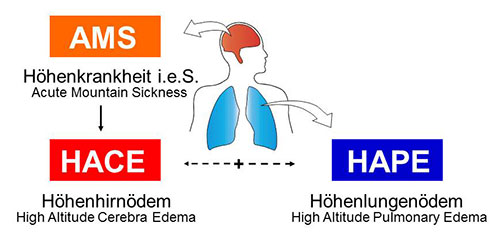 Das Höhenhirnödem beruht vermutlich auf einer identen Krankheitsentstehung wie AMS, und stellt die seltenere aber wesentlich gefährlichere Steigerung ersterer dar. Der Übergang von AMS zu HACE ist fließend. HACE kann innerhalb weniger Stunden zum Tode führen. Auch treten HACE und HAPE oft gemeinsam auf.